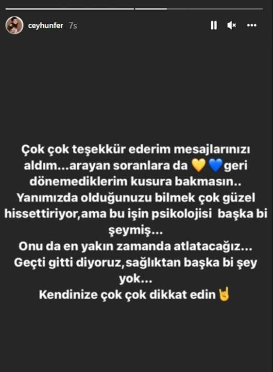 Çok çok teşekkür ederim, mesajlarınızı aldım. Arayan, soranlara da… Geri dönemediklerim kusura bakmasın. Yanımızda olduğunuzu bilmek çok güzel hissettiriyor ama bu işin psikolojisi başka bir şeymiş. Onu da en yakın zamanda atlatacağız. Geçti, gitti diyoruz; sağlıktan başka bir şey yok. Kendinize çok çok dikkat edin.